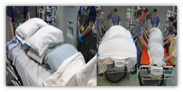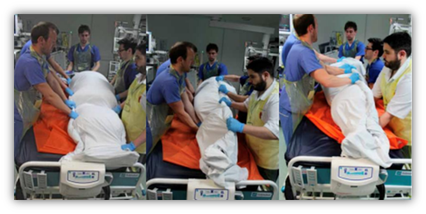 • On the call of the Airway Doctor, at the head end, whilst maintaining a tight grip on the rolled-up sheets the patient is rotated 90°, to lie on their side (now facing towards the ventilator).