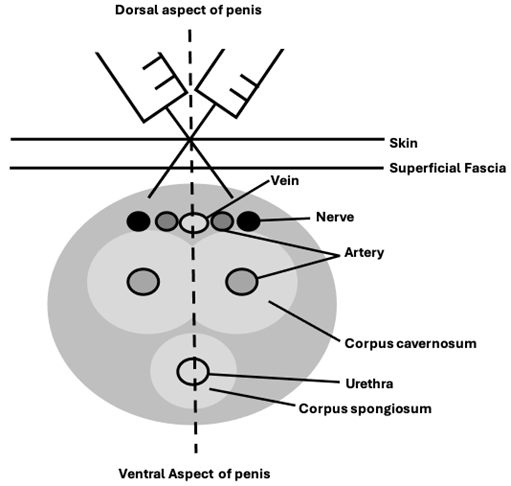 Figure 2: Cross section of penile anatomy. Needle inserted at midline and LA applied at depth of 3-5 mm bilaterally.