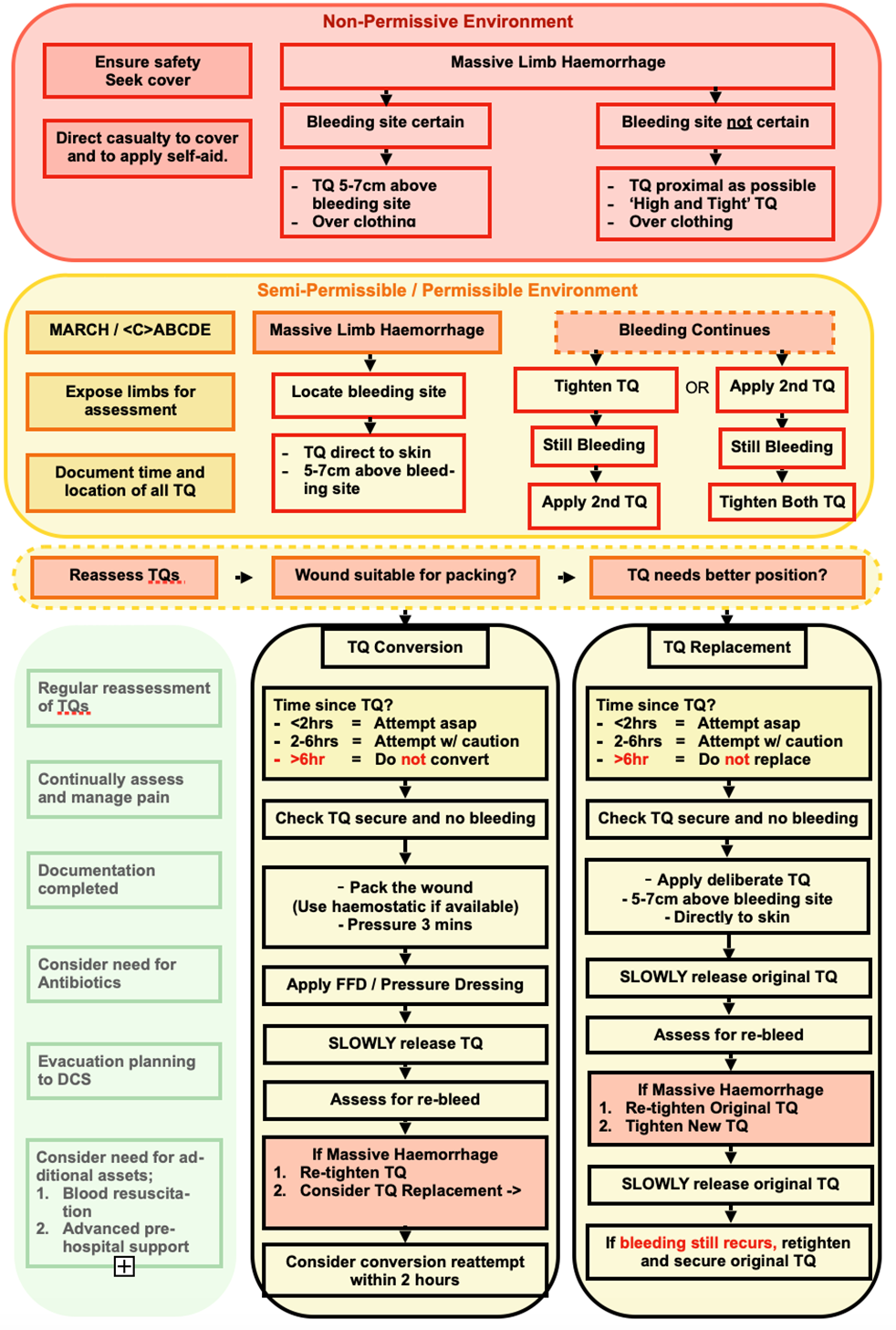 Can it be converted? As a situation changes and/or a patient is transferred, the environment is likely to become more permissive and additional resources will become available, allowing a wound to be controlled without a tourniquet using other techniques such as wound packing, pressure dressings and haemostatic dressings.Reassessment is especially important: