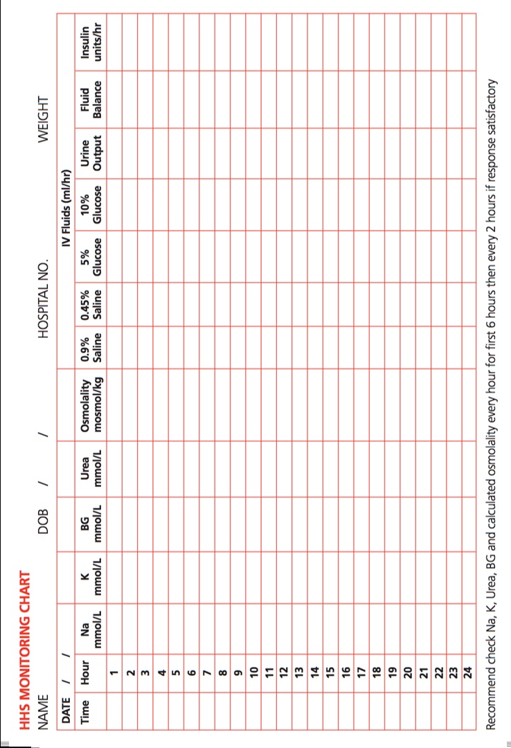 - Chart osmolality and glucose (overleaf) – see 'blood glucose falling < 2mmol/L per h' if relevant
