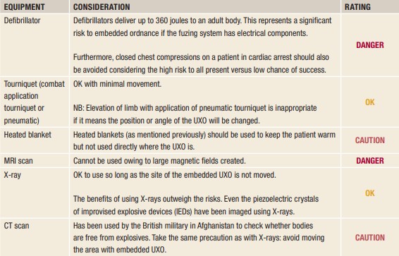- Once the decision to treat a casualty with embedded UXO has been taken, serious consideration must be given to what specific equipment could be used and how it should be used. Some UXO items are more sensitive than others; in the case of manufactured military ordnance, it is generally the fusing system which dictates the sensitivity.