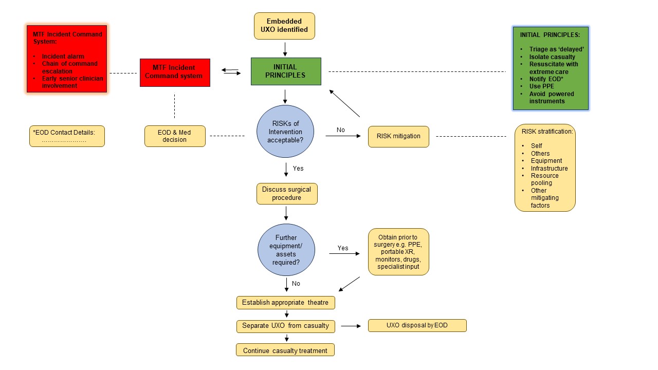 - Once the alarm has been raised regarding an embedded UXO in a casualty arriving at an MTF, early senior clinician and EOD involvement will be required, with regular liaison with the chain of command.